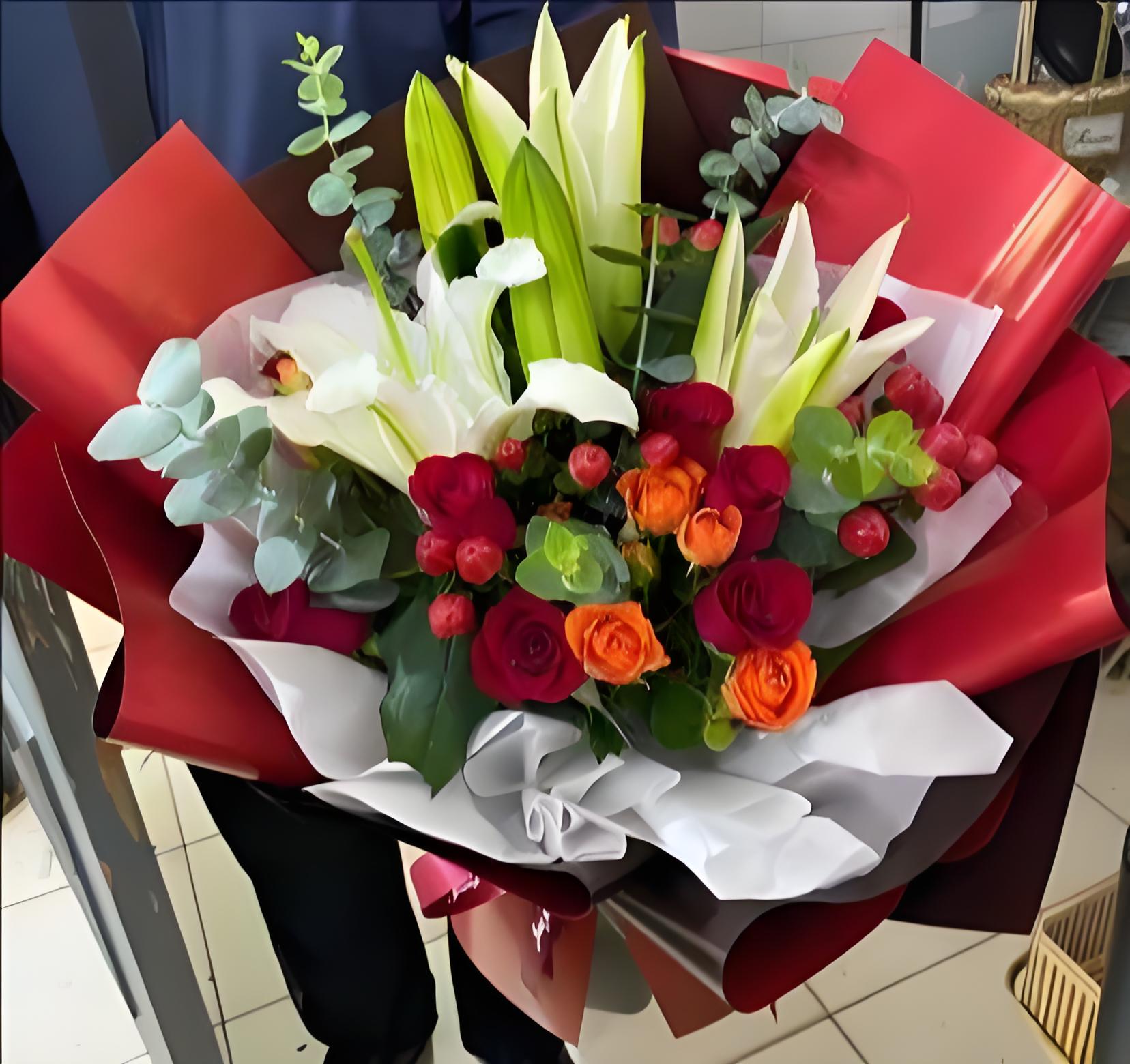 鄂尔多斯伊金霍洛旗花店包11枝红玫瑰、2枝多头白百合、6枝橙色多头玫瑰、红豆、尤加利叶